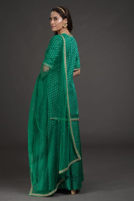 Emerald green and gold brocade silk lined banarasi woven lehenga. Paired with embroidered tunic & dupatta.
