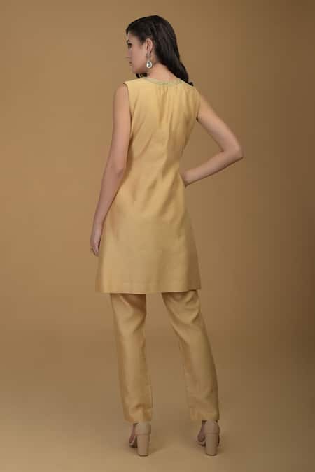 Gold short kurta highlighted with delicate embroidery, round neckline, sleeveless & straight silhouette. Comes with pant & dupatta.
