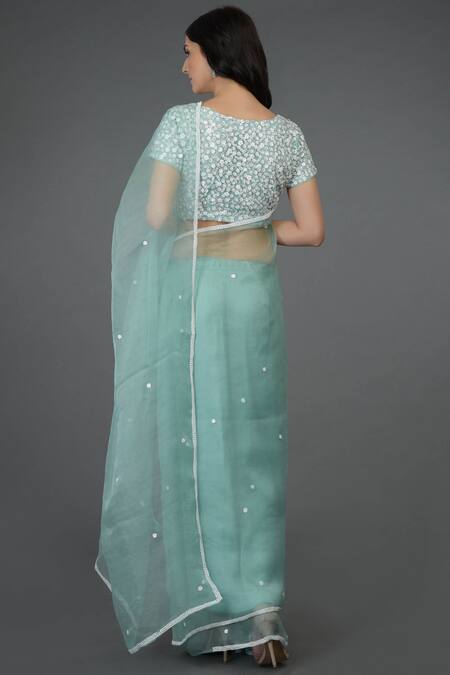 Aqua blouse with all-over floral motif work. Comes with organza saree.