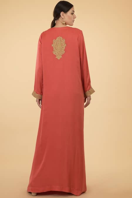Buy_Talking Threads_Coral Modal Satin Round Embroidered Kaftan _Online_at_Aza_Fashions