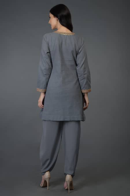 Grey Cotton, Crepe Round Embroidered Kurta Dhoti Pant Set