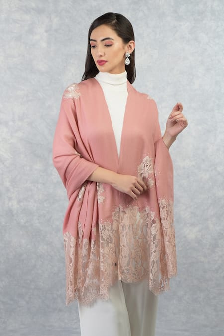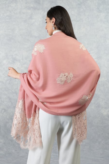 Pastel pink cashmere stole featuring beige French Chantilly lace buttis and scallop cutwork hem