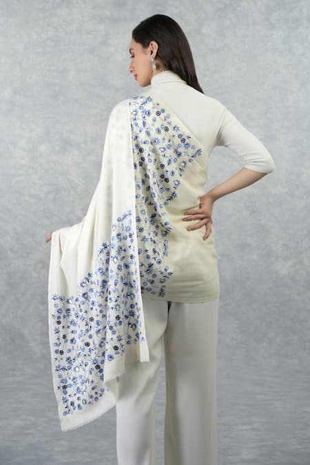 Ivory cashmere stole featuring floral motifs hand embroidered in blue and white silk floss
