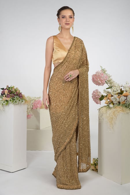 Gold saree highlighted with intricate textured sequin-bead embroidery. Comes with plunging neckline blouse.