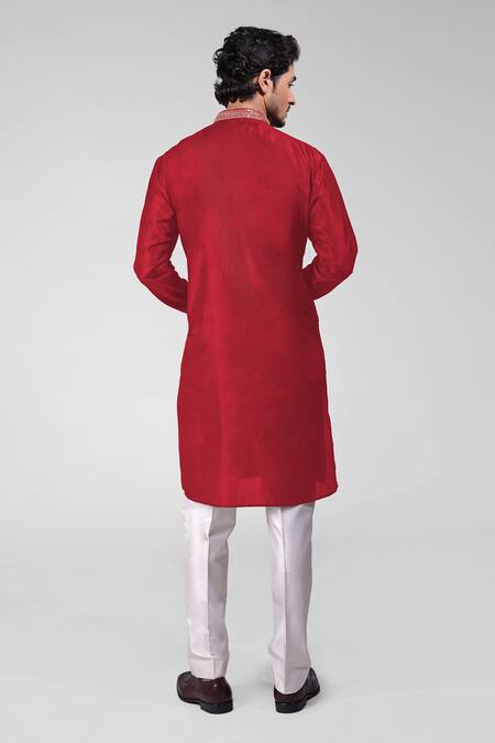 Red silk kurta featuring intricate beadwork and sequins with zardosi embroidery on the placket. Paired with matching pants, this set is designed for comfort and elegance.