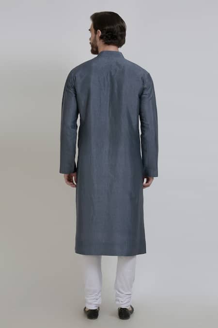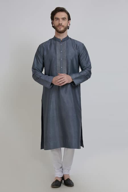 Grey silk kurta with embroidered detail around buttoned placket.