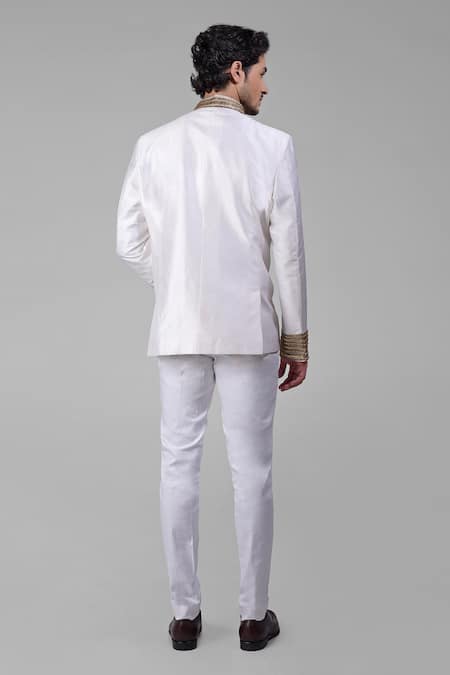 Ivory bandhgala featuring intricate zardozi work and thread hand embroidery. Paired with matching pants, this set is made of silk and includes a mandarin collar and full sleeves.