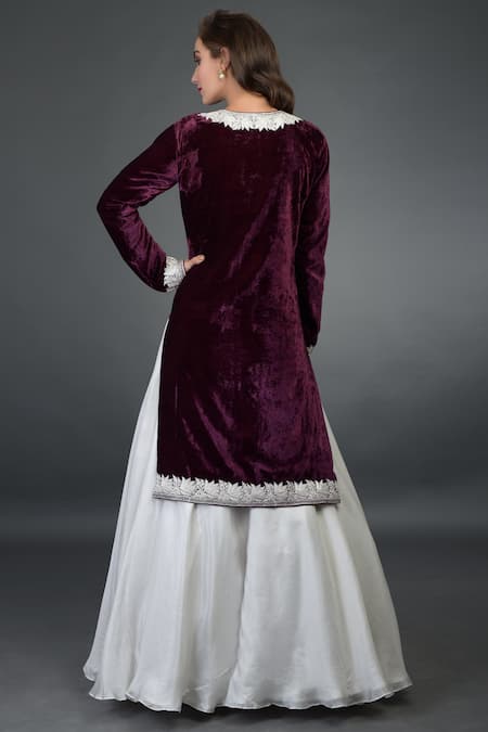 Plum velvet kurta with tilla embroidery & straight silhouette. Paired with silk flared skirt & dupatta.