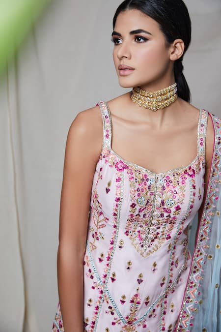 Pink embroidered chanderi kurta with foil, resham, abla, gota embroidery. Paired with gharara & contrast dupatta.