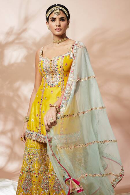 Bright mustard embroidered kurta with gota, applique, mirror & resham work. Comes with sharara & dupatta.