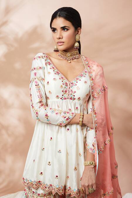 Ivory peplum kurta with foil, resham, abla embroidery. Comes with gharara & contrast dupatta.