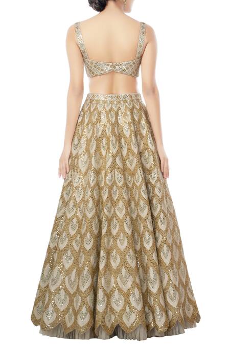 Ivory layered lehenga with all over resham & mirror work. Comes with bustier-style blouse & dupatta.