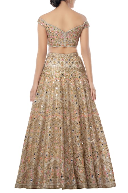 Ivory lehenga with all over resham & foil work floral bel motifs. Comes with blouse & dupatta.