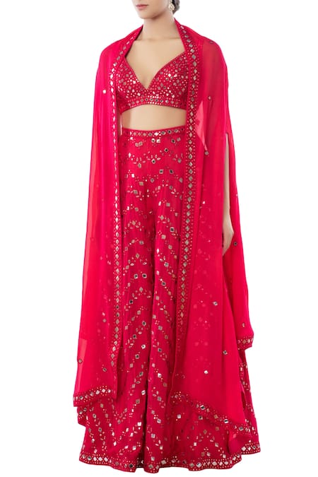 Pink georgette sharara with foil print, resham & mirror work. Paired with embroidered blouse & cape.