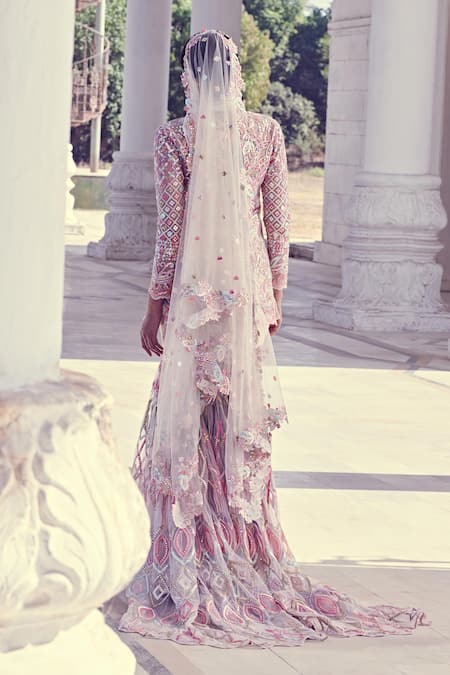 Ivory sheer jacket-style kurta with multi-color resham -dori work & mirror-foil embellished motifs. Comes with trail detail sharara pants, inner crop top & dupatta.