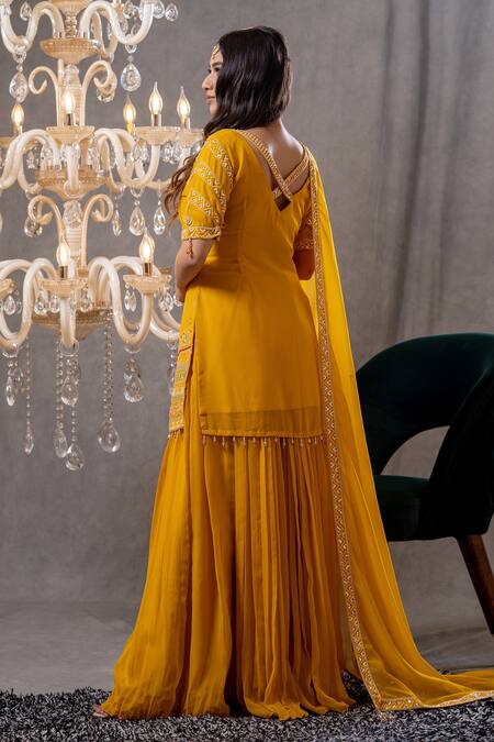 Mustard yellow short kurta with sequin embroidered floral motifs. Paired with lehenga & dupatta.