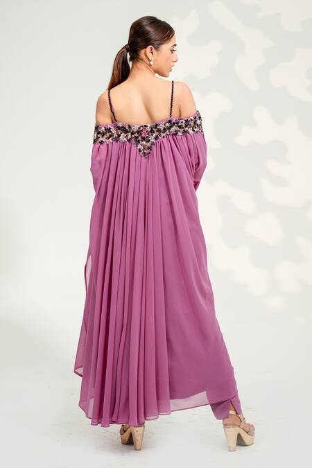 Purple off shoulder top in georgette featuring gathered, high low details and crystal hand embroidery. Paired with matching pant for a complete look.
