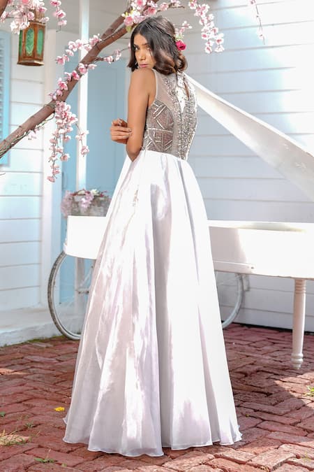 Grey Organza, Taffeta Silk Round Embroidered Gown