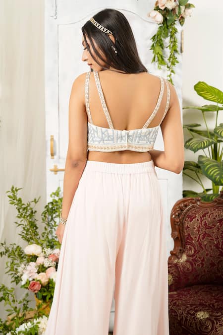 Rose pink corset style blouse with sequin and cutdana embroidery. Comes with flared pants and sheer jacket.