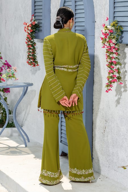 Mehendi green jacket kurta featuring crystal, sequin, and cutdana embroidery with a shawl collar. Paired with flared pants and a dupatta with a Persian blue printed border.
