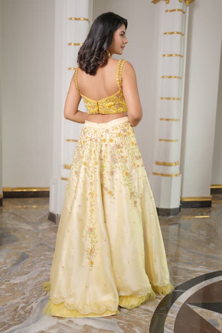 Yellow lehenga featuring hand embroidered floral patterns with tonal glass beads, crystals, and sequins. Paired with a padded blouse and embroidered dupatta with scalloped cut work details.