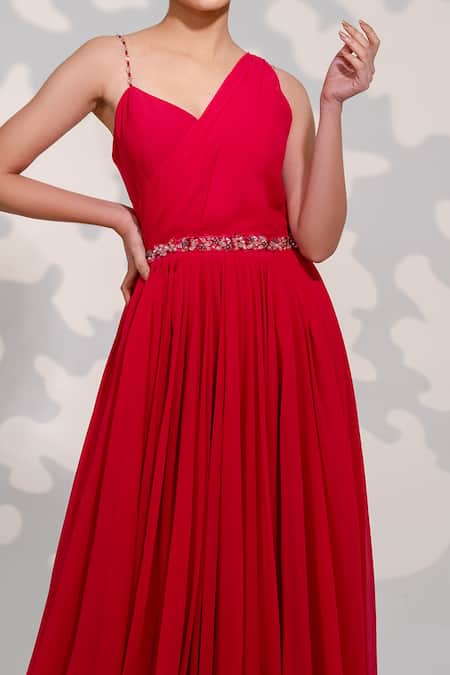 Crystals hand embroidery along the waist, One shoulder drape pleated design, Back deep neck design