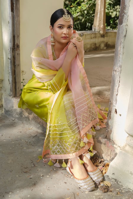 Green straight kurta featuring sequin, pearl & glass bead placement hand embroidery. Paired with a matching pant and an ombre dupatta.