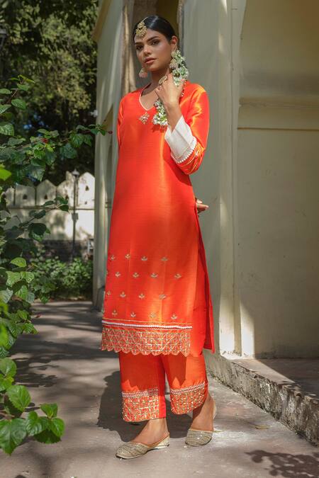Orange Silk Pearls, Sequins, Beads Round Neck Hand Embroidered Kurta Set