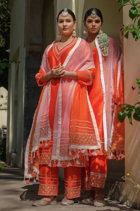 Orange straight kurta featuring leaf neckline with hand embroidered sequin, pearl, and glass bead placement. Paired with matching pant and an ombre dupatta.