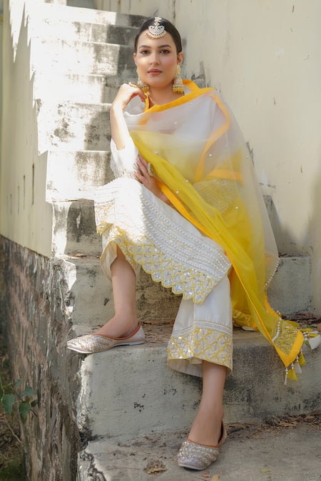 Ivory straight kurta featuring hand embroidery with sequin, pearl, and glass bead placement. Paired with matching pants and an ombre dupatta.