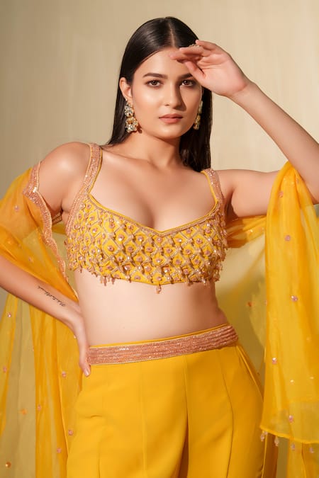 Mustard yellow crystal and sequin embellished strap blouse. Paired with a kalidar bootcut flared pant and cutwork scallop organza cape with tassels.
