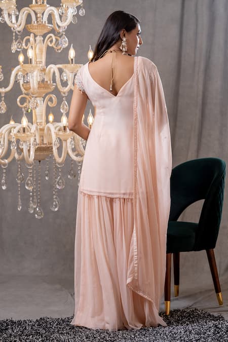 Rose pink short kurta with floral embroidered motifs in chevron pattern. Paired with lehenga & dupatta.