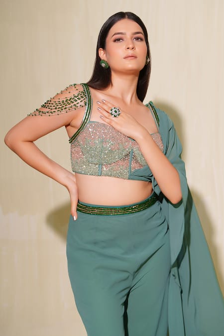 Buy_Tamaraa By Tahani_Green Georgette Hand Embroidered Sequin Mallika Corset With Flared Pant _Online_at_Aza_Fashions