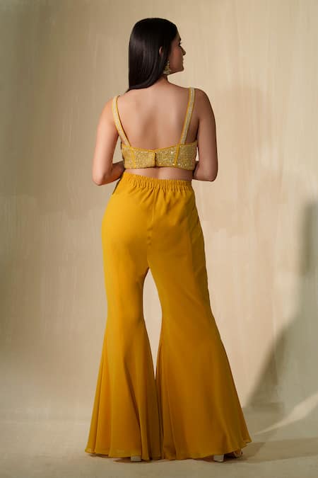 Buy_Tamaraa By Tahani_Yellow Georgette Embroidered Crystal Sweetheart Nargis Cape Flared Pant Set _at_Aza_Fashions
