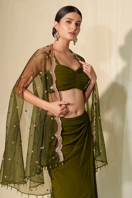 Dark olive green embroidered bustier with a sweetheart neckline and sleeveless design. Paired with a draped dhoti skirt and an organza scallop cape featuring tassels.