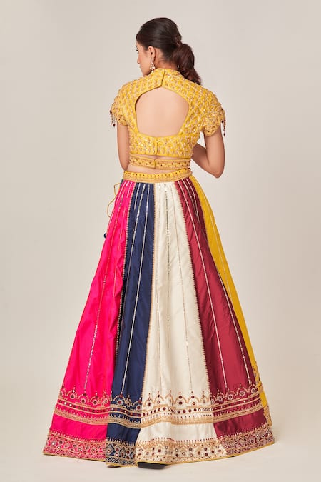 Multicolor mirror work motif embellished color blocked lehenga with sequin embellished inverted V cut out choli. Comes with beaded tassel ornamented dupatta.