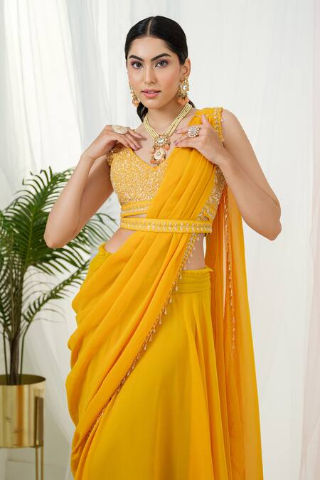 Mustard yellow pre-draped saree featuring hand embroidery with sequins, crystals, and glass beads. Accompanied by a belt attached blouse with front belt cut-out detailing and all over embellishments.