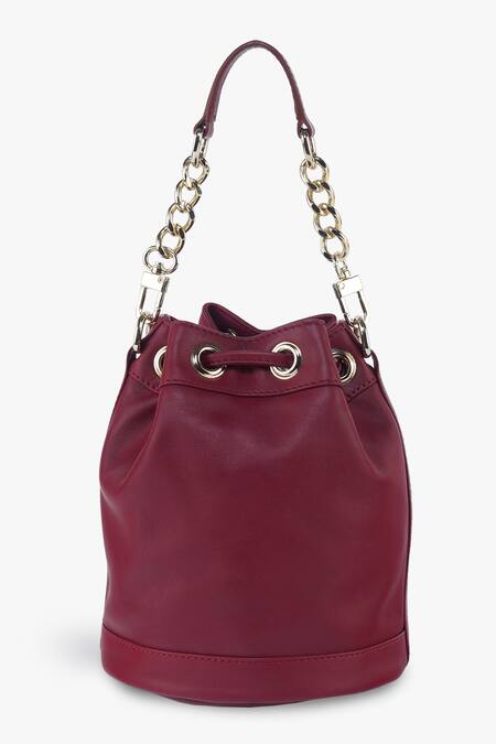 Maroon bucket bag crafted from full grain genuine nappa leather with a structured base. Features detachable top handle and leather sling strap.