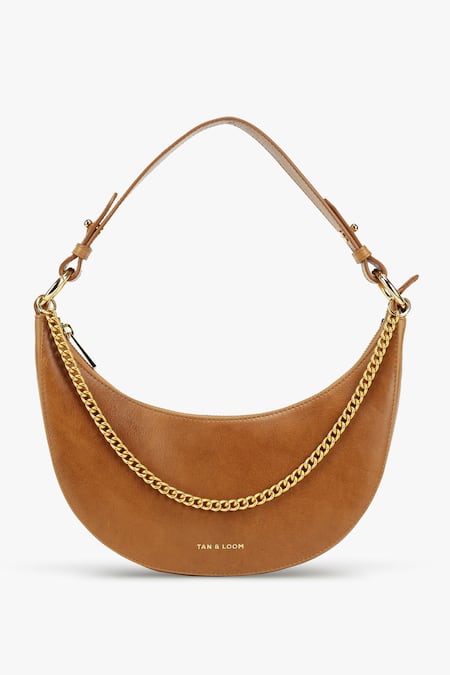 Brown crescent shape handbag featuring a metallic chain detail and adjustable handle