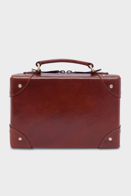 Vintage brown mini trunk style boxy sling bag crafted from vegetable tanned genuine leather