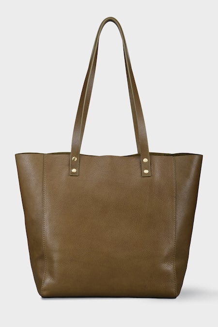 Olive green tote bag made from genuine leather featuring one front patch pocket and one detachable pouch. Includes an interior zip pocket, slip pocket, and key ring holder for added convenience.
