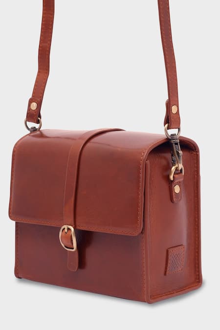 Vintage brown box bag featuring a front flap opening with a show buckle and a removable shoulder strap