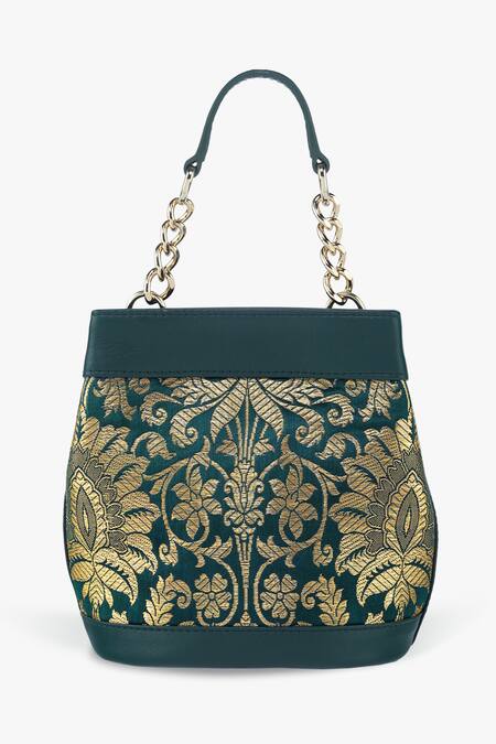 Green potli bag featuring contrast floral woven patterns