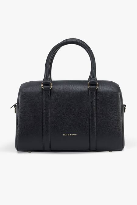 Black pebble grain genuine leather handbag featuring a structured shape and textured details