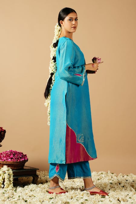 Blue kurta featuring pink patchwork and gota lace work embroidery in floral pattern. Paired with matching pant for a complete look.