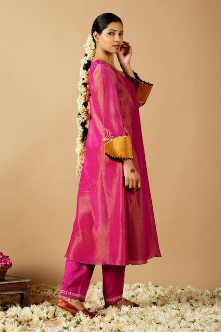 Pink Tissue Sequins, Patchwork, Embroidery Asymmetric Floral Kurta With Pant