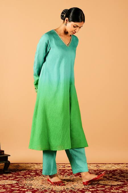 Green Chanderi Silk Gota Patti V-neck Ombre A-line Kurta With Pant