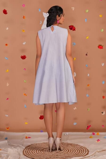 Shop_Tangerine By Asfa_Blue Chanderi Fabric Flowers Round Neck Floral Hand Embroidered Dress_at_Aza_Fashions