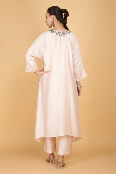 Ivory kaftaan featuring an embellished neckline and a relaxed silhouette. Paired with matching ivory pants made from cotton silk.