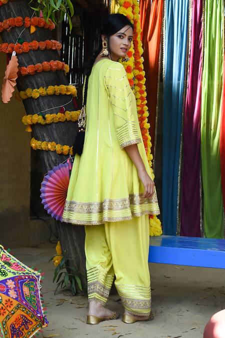 Lime green short anarkali with gota embroidery. Comes with lace embroidered dhoti pant.